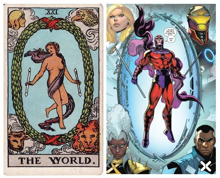 Lastly we have a rendition of The World. In a wreath forged by his own power over metal, Magneto stands triumphant, resurrected. And the usual astral houses are here represented by Iron Man and Emma Frost (at the time fighting their own battles against Orchis as part of the Fall of the House of X) and Storm and The Blue Marvel (who’s science enabled Storm to travel to The Waiting Room).